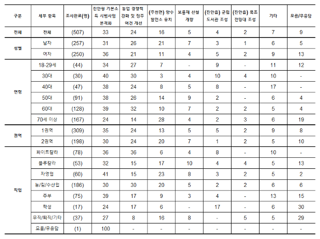 군민 24%가 시급하다고 꼽아 현안 2위에 오른 ‘농업경쟁력강화 및 정주여건 개선’의 경우, 연령별로는 60대(32%), 직업별로는 화이트칼라(36%)의 시급성 인식이 높았다.