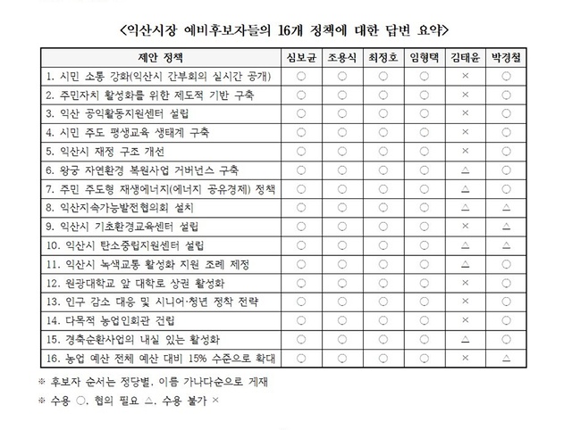 각 후보들은 자치행정·기후환경·민생경제·농업농촌 등 4대 분야 16개 정책에 대해 수용, 협의 필요, 수용 불가 등의 입장과 함께 개별 정책별로 검토 의견을 제시했다.