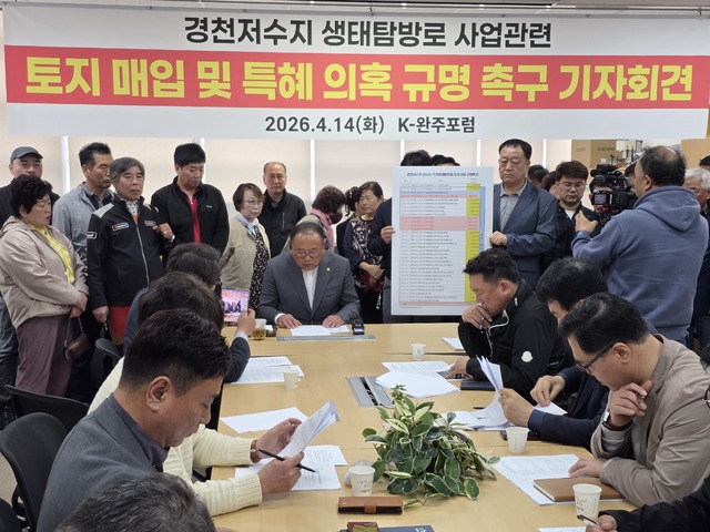 K-완주포럼(위원장 양현섭)은 14일 완주군청 브리핑룸에서 기자회견을 열고 경천저수지 일대에서 추진된 ‘산수인 국가생태탐방로 조성사업’ 과정에서 특정 법인의 토지 매입과 특혜 채용 의혹이 드러났다고 주장했다.