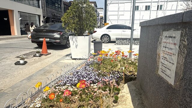 27일 전북일보 취재를 종합하면 지난달 18일쯤 전라감영 서편 부지 주변에 화단이 조성됐다. 전라감영에서 웨리단길로 향하는 길목에 가면 주정차된 차량 사이로 알록달록한 꽃이 피어 있는 것을 볼 수 있다.