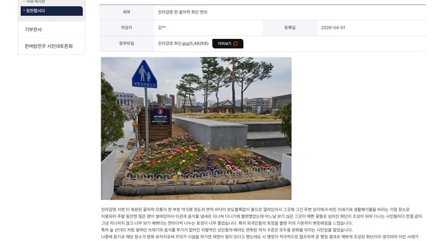 담당 주무관은 “시청 게시판에 이런 글이 올라온 줄은 몰랐다”면서 “민원을 제기했던 상인, 전라감영에서 근무하는 기간제 근로자분들을 통해서 화단 옆에서 도란도란 이야기를 나누는 분들도 생기고, 분위기가 좋아졌다는 이야기를 전해 들었다”고 말했다.