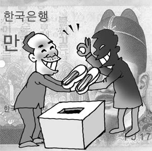 돈 선거는 고무신선거나 막걸리 선거에서 유래한다.후보자가 유권자에게 고무신을 선물로 줬다해서 고무신선거다.역사책에나 나올법한 얘기다.하지만 이번 총선에서도 막걸리 선거와 고무신 선거의 망령이 되 살아나고 있다는 것.예상 투표율이 50% 초반에 그치고 초경합 선거구가 늘면서 후보들이 돈으로 표를 사려는 유혹에 빠지기 쉽게 돼 있다.