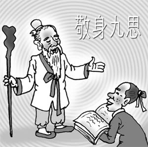 언사충(言思忠).말을 할때는 진실하고 실천 가능한 말만 해야겠다는 것을 생각해야 한다는 것.사사경(事思敬).행동을 할 적에는 남을 높히고 모든 일을 바르게 해야 할 것을 생각해야 한다는 것. 의사문(疑思問).의문이나 의심나는 일이 있으면 언제든지 물을 것을 생각해야 하며 분사난(忿思難)은 분한 일이 있으면 더 큰 어려움이 있다는 것을 생각해야 하며 견득사의(見得思義)는 이득을 취할 수 있는 일이 있거든 취하는 것이 옳은지 옳지 않은지를 생각해야 한다는 것.