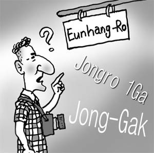 "은행로"를 영어로 표시한다는 것이 "Eunhang-Ro'이다. 소리나는대로 알파벳을 나열한 것이다. 이런 잘못된 영어 도로 표시판은 한문을 모르는 한글세대들 공무원들의 우리말에 대한 무지의 소치라고 본다. 서울의 도로, "종로"는 고유명사가 아니다. "종로"라는 명칭은 "종각(鐘閣)"이 있는 거리라는 뜻에서 "종(鐘)"이라는 말과 "거리"라는 뜻의 한자 "가(街)"자를 붙여 만든 합성어이다. 그러므로 "종로 1가"를 영어로 제대로 표시하면" Jong_Ro 1 Street" 이다.