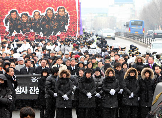 용산참사 철거민 희생자들의 범국민장 영결식이 열린 9일 참석자들이 희생자들의 대형그림과 함께 용산참사 현장으로 향하고 있다. (desk@jjan.kr)