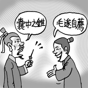 모수는 전국시대 조(趙)나라 평원군의 식객중 한 사람이었다. 평원군이 초(楚)나라에 원군을 청하러 가기위해 20명을 뽑는 과정에서 한 명이 모자라자 모수가 자기를 끼워달라며 스스로 나선다. 이때 평원군이 한 말이 '낭중지추(囊中之錐)'다. "재능이 뛰어난 사람은 주머니속에 든 송곳처럼 드러나는 법인데 문하에 있은지 3년동안 보여준 것이 없지 않느냐"는 타박이었다. 모수가 재치있게 반론을 폈다. "제가 저를 천거하는 것은 저를 주머니안에 넣어달라는 말입니다. 그러면 벌써 삐져나왔을 것입니다." '모수자천(毛遂自薦)'의 고사다. 낭중지추와 모수자천은 같은 고사에서 유래됐다.