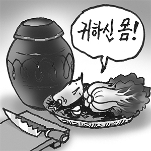 배추 한포기에 1만원 간다고 아우성이다.김치가 금치가 돼 매일 먹던 식탁에서 종적을 감출 태세다.아이들은 몰라도 어른들은 김치 없으면 밥 못 먹을 정도인데 수급사정이 곧바로 풀리지 않을 전망이어서 걱정이다.배추김치는 비타민 A,B,C를 비롯 그 부재료가 지닌 다양한 영양 때문에 한국인의 장수식품으로 꼽혀왔다.발효식품의 총아인 김치가 우리 식생활에서 차지하는 비중은 막중하다.외국에 잠시 나가 있을 때도 삼겹살에 소주와 배추김치가 가장 생각나지 않던가.김치가 한류열풍을 타고 문화 아이콘이 되면서 수출도 확대되었다.