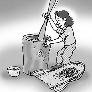 이것을 절구통에 넣어 찧거나, 디딜방아로 가져가 찧었다. 한번 찧은 나락을 키로 까불러 벗겨진 껍질을 날려보내고 다시 찧었다. 키질에도 요령이 필요했다. 쌀 한톨 나가지 않고 껍질만 솔솔 내보내는 게 고수급이다.