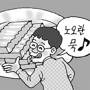 여기서 청포묵은 녹두를 갈아 앙금으로 만든 묵이다. 해열·해독 작용과 보양에 좋으나 색깔이 곱지 않은 게 흠이다. 그래서 격(格)을 높인 게 황포묵(노랑묵)이다. 앙금이 엉기기 시작할 때 자연 색소 중 최고인 치자물을 넣은 것이다. 탱탱하면서도 낭창낭창한데다 맑고 노란 색감이 입을 유혹한다.