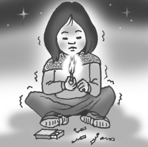 추운 겨울 어느 날, 굶주린 배를 채우기 위해 눈 위를 맨발로 걸어 다니며 성냥을 파는 소녀가 있었다. 날이 어두워졌지만 소녀는 성냥을 모두 팔지 못했다. 소녀는 성냥을 팔지 못했다고 혼낼 아버지가 무서워 집에 돌아갈 수 없었다. 어느 집 앞에 쪼그리고 앉아 언 손을 호호 불어댔지만 밤이 깊어지면서 더하는 추위를 견딜 수 없었다. 소녀는 어쩔 수 없이 성냥을 꺼내 불을 붙였다. 첫 번째 성냥불은 커다란 난로가 되어 온 몸을 녹여줄 것 같았다. 하지만 안타깝게도 금세 꺼지고 말았다. 두 번째 성냥을 그어 불을 붙이니 푸짐한 음식이 차려진 식탁이 나타났다. 세 번째 성냥불에서는 크리스마스트리 불빛 속에서 다정하게 미소 짓는 할머니가 보였다. 소녀는 할머니가 너무 보고 싶어 성냥을 마구 그어 불을 붙였다.