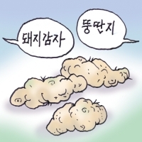 돼지감자는 뚱딴지라고도 한다. 사전에 따르면 국화과에 속하는 여러해살이풀인 돼지감자는 땅속줄기가 감자 모양이다. 줄기는 높이 1.5~3m이고 잔털이 있다. 잎은 마주나는데 윗부분에서는 어긋나 해바라기 잎과 비슷하다. 9~10월에 노란 꽃이 피는 돼지감자의 땅 속 덩이줄기는 사료나 알코올의 원료로 쓰인다.