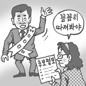 선관위에서 이같이 후보자의 됨됨이를 판단할 수 있는 중요한 정보를 공개하고 있음에도 유권자들이 이를 간과하는 경우가 많다. 아직도 지연 학연 혈연 등 연고주의에 의한 고질적인 투표 행태가 여전하기 때문이다. 또 인물이나 자질 능력 정책 보다는 옷 색깔만 보고 찍어주는 맹목적인 선거 풍토도 상존한다. 이러고도 인물 탓, 정치 탓만 계속 한다면 유권자 스스로 누워서 침 뱉는 격이다.