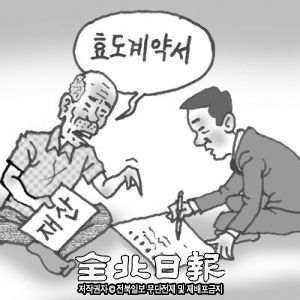부모와 자식은 천륜(天倫)이며 효는 백행(百行)의 근본이다. 그럼에도 부자간에 효도 계약서를 써야하는 세태가 너무 서글픈 현실이다. 아무리 내리사랑이라 하지만 자녀에게 하는 것에 십분의 일이라도 부모에게 한다면 모두 효자 효녀가 될 것이다.