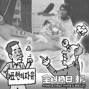 지난 2004년 한나라당 국회의원 24명이 대거 출연해 노무현 대통령에 대한 저급한 비하와 성적욕설을 퍼부은 연극 ‘환생경제’에는 도저히 비할 바가 아니지만, 정치적으로 민감한 시점이기 때문이다. 보수단체 회원들이 그림을 훼손하고 전시를 중개한 표창원 의원에 대해 새누리당이 국회에 징계안을 제출하고 민주당이 자체 윤리위에 회부하고, 일베충들이 그의 가족까지 공격하는 등의 일련의 행태는 정치를 빼고는 설명하기 어렵다.