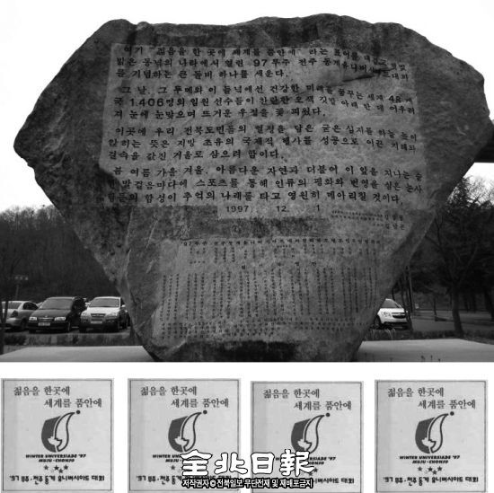 전주 화산체육관 앞에 있는 무주·전주 동계U대회 기념비에 새겨진 비문 전문이다. 기념비는 동계U대회를 치른 후 그 해 말 세워졌다. 김남곤 시인(전 전북일보 사장)이 쓴 이 비문만으로도 당시 무주·전주 동계U대회가 갖는 의미를 잘 살필 수 있다.