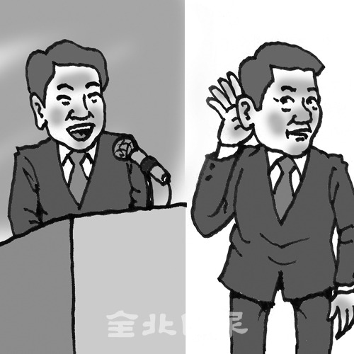 그래서 권력이 세질수록 입은 닫고 지갑은 열고 잘 들어야 한다고 하지 않던가. 갑자기 대변인·대청인 이야기를 하는 이유가 있다. 며칠전 자유한국당 나경원 원내대표가 “더 이상 대한민국 대통령이 김정은 수석대변인이라는 낯뜨거운 이야기를 듣지 않도록 해달라”고 말하면서 커다란 파문이 일었다. 대북정책을 둘러싸고 비판하다가 너무 나가면서 “일국의 대통령에 대해 할말, 안할 말을 가려서 해야하지 않느냐”는 반격에 직면한 바 있다. 대변인 경력을 지녔기에 나경원 원내대표의 발언은 더욱 세련미가 부족한듯 하다. 그런데 도내 관공서에 대변인은 차고 넘치는데 이젠 대청인도 필요해 보인다. 자사고 문제와 관련해서 1000명이 넘는 이해 관계인이 교육감을 찾았으나 듣기 싫어서인지 연가를 내고 자리를 비운 김승환 교육감을 대신해 들어줄 대청인(代聽人) 말이다. 이제 우리 사회에서도 대변인 뿐 아니라 대청인도 필요한 시대가 다가오고 있는지도 모른다.