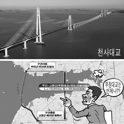 반면 천사대교보다 앞서 추진했던 전라북도의 부창대교는 15년째 오리무중이다. 고창출신 정균환 의원의 16대 총선 공약으로 시작된 부창대교는 지난 2002년 예비타당성 조사에 이어 2005년 기본설계까지 마치고 2007년 착공 예정이었지만 경제성 부족을 이유로 중단됐다. 이후 2008년 전라북도에서 부창대교 건설을 재추진, 2011년 새만금종합개발계획에 포함됐고 2012년 대선 공약사업 선정과 2015년 제4차 국도·국지도 5개년(2016~2020년) 계획에 반영됐지만 2016년 박근혜 정부에서 또다시 경제성 부족을 이유로 중단시키고 말았다.