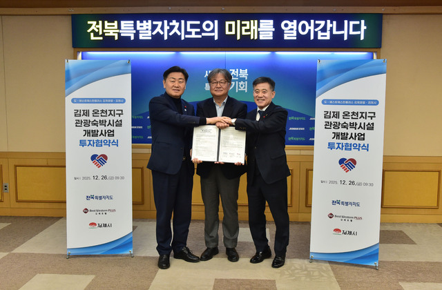 시는 지난 26일 전북특별자치도청 도지사 회의실에서 김관영 전북특별자치도지사와  정성주 시장, ㈜베스트웨스턴플러스 김제호텔 김해영 대표 등이 참석한 가운데 김제 온천지구 관광숙박시설 개발사업을 위한 투자협약을 체결하고, 호텔 건립을 위한 행정적·재정적 지원과 성실한 투자 이행을 약속했다.