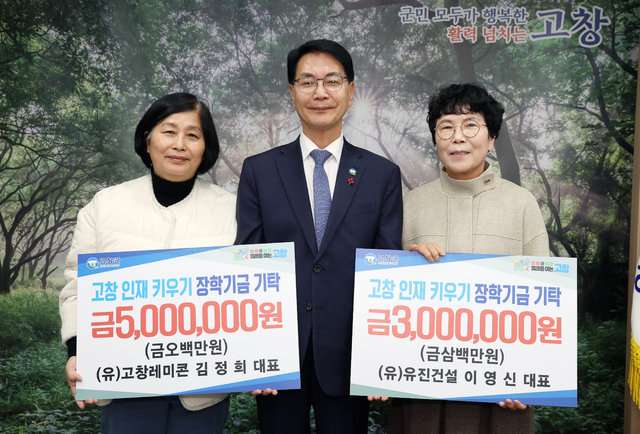 19일 고창군장학재단에 따르면 이날 ㈜고창레미콘 김정희 대표가 500만원, ㈜유진건설 이영신 대표가 300만원, 고창친환경블루베리연구회(회장 백석기)가 200만원, 성송면 이성진 씨가 100만원을 기탁하며 지역 인재 육성에 뜻을 모았다.