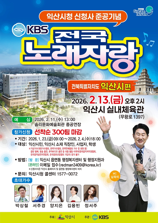 시 관계자는 “신청사 준공은 익산의 미래를 여는 상징적인 순간”이라며 “전국노래자랑을 통해 시민과 함께 신청사 개청을 축하하고 익산의 밝은 에너지를 전국에 전하겠다”고 말했다.