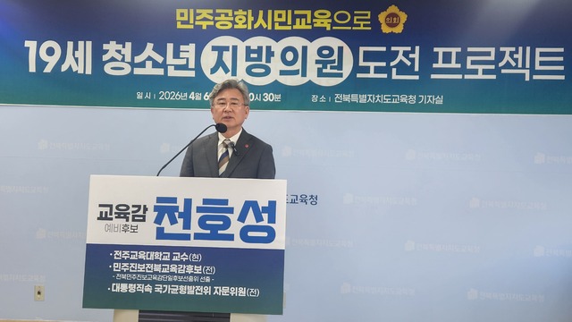 천호성 전북교육감 예비후보가 학교 민주시민교육의 대폭 강화를 통해 고등학교 졸업 직후 지역사회를 이끌 ‘19세 청소년 지방의원’을 배출하겠다는 도전적인 공약을 발표했다.