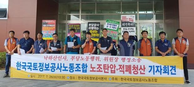 국토정보공사 노조는 26일 혁신도시 내 본사 정문 앞에서 기자회견을 열고 사측이 차진철 노조위원장을 상대로 행정소송을 제기한 것과 관련해 ‘국토정보공사 사측은 새 정부의 기조와는 반대로 가고 있다’며 강력 반발했다.
