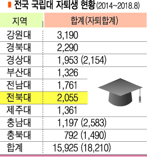 최근 5년 간 전북대학교를 포함한 전국 국립대 자퇴생이 1만8000명이 넘으면서 이에 대한 관리방안과 대책마련이 요구되고 있다.