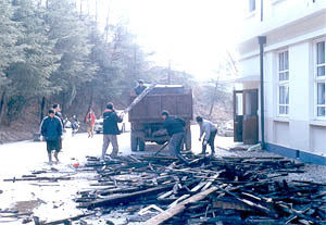 이들은 지난 18일부터 트럭을 동원해 타다 남은 책상과 걸상을 들어내고 불필요한 자재를 치우는 등 정리작업을 펼쳤다.