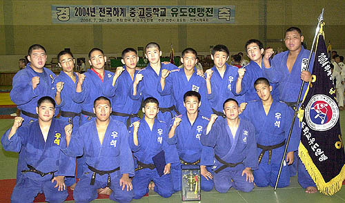 26일 열린 2004 하계 중고연맹전 유도 남자고등부 단체전에서 우승한 우석고 선수들이 파이팅을 외치고 있다.../이강민기자 이강민(lgm19740@jjan.kr)