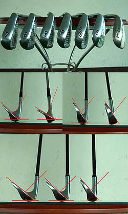 다음의 사진들은 클럽의 특성을 나타낸 것이다. 각 클럽은 고유의 각도(loft)가 있고, 이러한 각도는 골프 볼이 비행하는 거리에 영향을 미치게 된다. 사진의 클럽이 모든 클럽을 대표하는 것은 아니지만 주로 어프로치에 사용되는 클럽인데, 그 특성을 이해하고 샷을 해본다면 많은 도움이 될 것이다. 사진에서 알 수 있듯이 각 클럽은 볼을 위로 뜨게 하려는 성질이 있다. 얼마만큼 띄워 칠 것인지 결정하고 클럽을 사용하면 볼의 컨드롤이 쉬워진다.