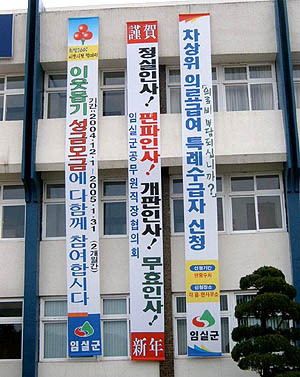 임실군 공직협이 새해 정기인사가 잘못됐다며 군청 청사에 관련 플래카드를 내걸었다. (desk@jjan.kr)