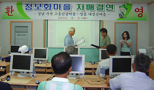 정읍시 내장상동 내장산 정보화마을과 경남 사천시의 고읍단감정보화마을간 자매결연식이 2일 내장산마을 정보센터에서 열렸다.