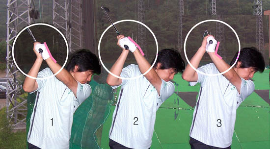 만약 자신의 볼이 슬라이스가 많이 난다면 손목을 2번사진과 같이 꺽으려는 감각을 사용해야한다. 반대로 훅이 많이 난다면 3번 사진과 같은 감각을 활용해야 1번 사진과 같이 바른 모양을 만들어 낼 수 있다.