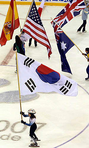 28일(한국시간) 이탈리아 토리노 타졸리 빙상장에서 열린 2007 토리노 동계유니버시아드 폐막행사에서 11일간의 열전에 참가한 각국 국기들이 입장하고 있다. 이번 대회에서 한국은 금10, 은11,동9개로 종합 1위를 차지했다.../연합뉴스 (desk@jjan.kr)