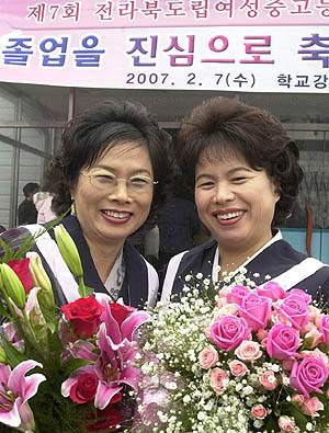 김윤덕·효녀씨 자매. 7일 전북도립여성중·고등학교(교장 김형남)를 졸업한 이들 자매는 어렵게 인터뷰에 응했다. 7남매나 되는 대가족에 가정형편까지 어려워 형제들중 자매가 학업의 기회를 양보해야 했다. 지금까지 건강하고 밝게 생활해왔다. 단란한 가정도 꾸렸고 아이들도 반듯하게 키웠다. 그러나 마음 한 켠에 공부에의 미련은 남아있었다.