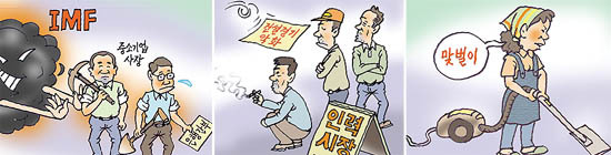 전주시내 한 인력사무소장은 “10여년 전에는 공사현장, 철거현장 등에서 뼈가 굵은 베테랑과 학비와 용돈을 벌려는 대학생 등이 대다수였지만 IMF이후에는 중소기업 사장 등 다양한 사람들이 찾고 있다”며 “막일꾼이 IMF로 몰락한 중년들의 안식처 역할을 하고 있다”고 말했다.