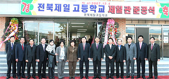 전북제일고등학교는 4일 오전 박영희 이리학원 이사장을 비롯한 국회 조배숙·한병도 의원·김병곤 도의회 의장·황현·김연근 도의원·김용균 총 동창회장·학부모·학생 등 700여명이 참석한 가운데 현지에서 제일관 준공식을 가졌다.