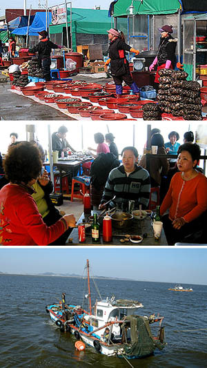 심포항 어귀에 다다르면 소박한 어촌풍경이 반기는 가운데 아주머니 몇몇이 좌판을 벌여 놓고 키조개를 비롯 소라, 피조개, 생합, 가리비 등을 정겨운 덕담과 함께 팔고 있다.