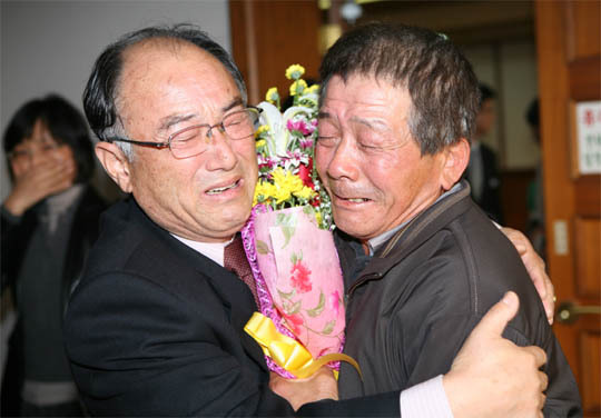 군산시 옥도면 개야도 납북어민 서창덕씨(오른쪽)가 전주지법 군산지원 형사법정에서 열린 재심선고 공판에서 무죄를 선고 받고 간첩혐의로 재심을 준비중인 김철씨와 부둥켜안고 눈물을 흘리고 있다. 오균진(moscow14@daum.net)