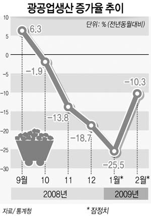 31일 통계청이 발표한 2월 산업활동 동향에 따르면 광공업생산은 전년 같은 달에 비해 10.3% 감소했다. 수치 자체를 놓고 보면 상당히 위협적이지만 1월의 -25.6%에 비해서는 개선된 수치다.