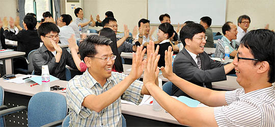 29일 전북대 교수·학습개발센터가 마련한 '유머교수법-유머로 유혹하라' 특강에서 수강생들이 손뼉을 서로 치며 수업을 진행하고 있다. 안봉주(bjahn@jjan.kr)
