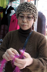 그리 넓지 않은 가게 안에는 뽀글뽀글 파마를 한 10여 명의 아주머니들이 옹기종기 둘러 앉아 손뜨개를 하고 있었다. 그 가운데 멋진 터번을 두르고 서서 순식간에 140코(뜨개질 매듭 단위)를 잡아내는 놀라운 솜씨만 봐도 박씨임을 한 눈에 알아챌 수 있었다.