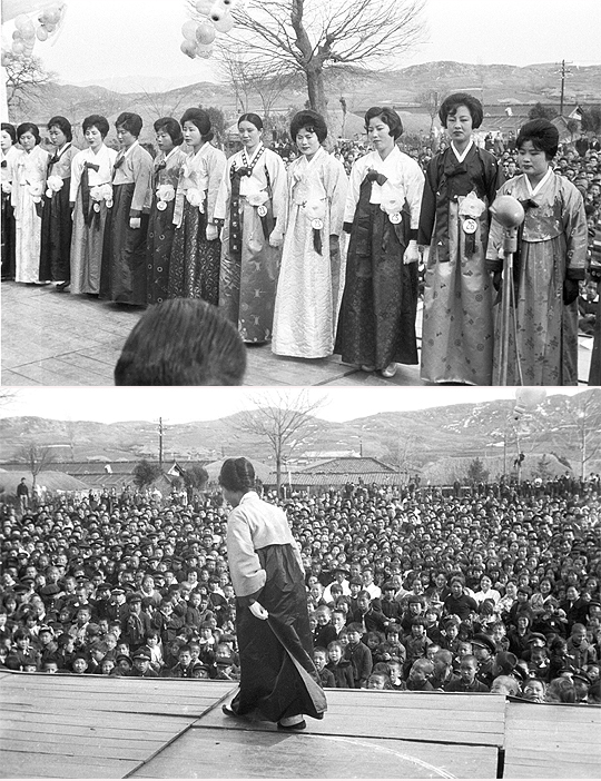 왼쪽은 임실에서 열린 '미스 고전' 후보들이 한복을 입고 고운 자태를 뽐내고 있는 사진이다. 심사위원들 앞에서 앞태와 뒷태를 뽐내고 있는 후보들의 모습에서는 수줍음과 은근한 열기가 함께 느껴진다. 오른쪽은 '미스 고전'에 출전한 한 후보가 치마를 휘어잡고 흰 버선에 꽃신을 신고 사뿐사뿐 걸어가고 있는 모습이다. 별 구경거리가 없던 시절. 관중들의 호응은 뜨거울 수 밖에 없었다.