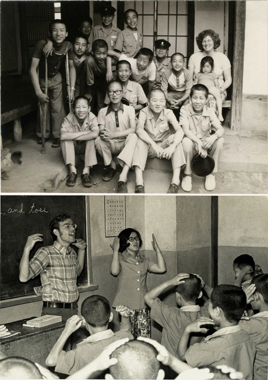 (위)1976년 충남 예산에서 한국인 제자들과 함께 한 스티븐슨 주한미국대사, 아래(1973년 경북 대구의 중학교에서 영어수업을 하고 있는 미국 평화봉사단원) (desk@jjan.kr)