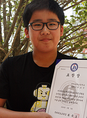 3일 전북교육문화회관에서 열린 '제88회 어린이날' 기념행사에서 모범어린이 표창을 받은 전주우림초등학교 6학년 이호진군(13). 학교에서 어린이회장을 맡고 있는 호진이는 "이 상은 동생들을 더 잘 돌보라는 뜻이죠"라며 "회장으로서 더욱 열심히 활동하겠다"고 말했다.