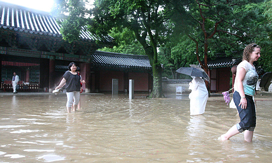 전주지역에 시간당 68.5m의 국지성 소나기가 내린 7일 전주 한옥마을 은행로의 하수가 역류하여 경기전이 무릎까지 물에 잠기자 관광객들이 맨발로 빠져나가고 있다. 추성수(chss78@jjan.kr)