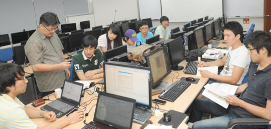 전북대 공대 7호관의 한 강의실. 방학을 맞아 학내는 조용했지만 어플 개발의 사명을 띤 수강생은 다음달 4일 실시하는 과제발표회 준비로 여념이 없는 모습이었다. 강의실을 찾았을 때 이들은 구글 넥서스원 휴대전화와 컴퓨터를 연결해 자신이 만든 프로그램이 실제 휴대전화에서 작동 여부를 살피고 있었다.