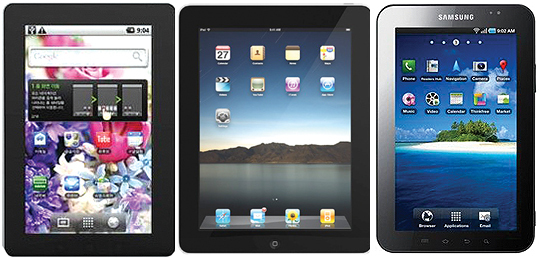 (왼쪽부터)안드로이다 '아이덴티티 탭', 애플의 태블릿pc '아이패드', 삼성의 '갤럭시 탭' (desk@jjan.kr)