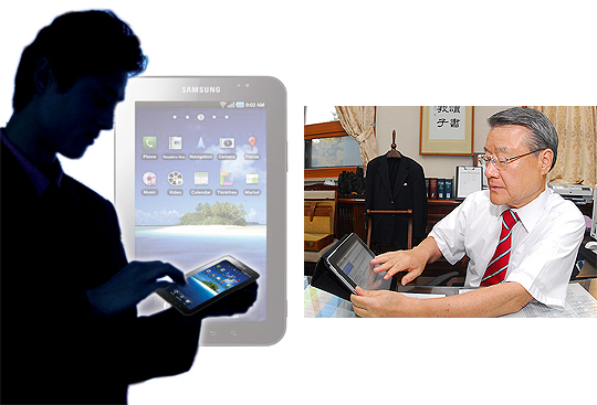 (좌)갤럭시 탭은 아직 국내 미출시인 상태로 도내에는 연구 목적으로 한달 전 도내 한 IT 업체에 1대가 지급되었다. 이 사용자는 갤럭시 탭의 최고 장점은 바로‘언제 어디서나’구현할 수 있는 휴대성을 들었다,우석대 라종일 총장은 아이패드를 적극적으로 활용하는 얼리어댑터 중 한 명이다. 전문성이 없는 사람도 쉽게 사용하도록 만든 게 장점이라며 노트북을 대체하고 있다며 아이패드의 장점을 설명했다. (desk@jjan.kr)