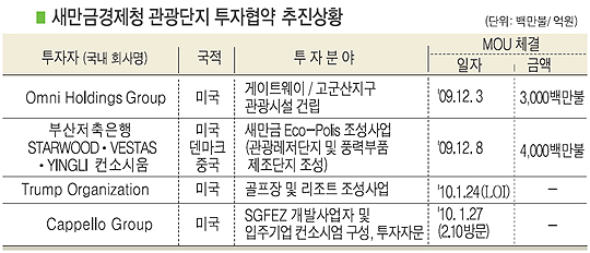 또 미국 스타우드 컨소시엄, 미국 카펠로그룹과 각각 새만금에 골프장 및 리조트를 개발하기 위해 맺어놓은 관광레저단지 조성사업 투자협약도 유효하다.